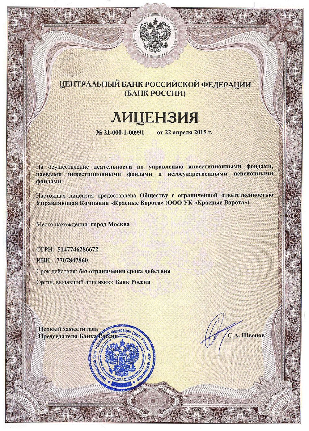 Общество с ограниченной ответственностью Управляющая Компания «Красные Ворота» имеет лицензию Банка России от 22.04.2015 г. 21-000-1-00991 на осуществление деятельности по управлению инвестиционными фондами, паевыми инвестиционными фондами и негосударственными пенсионными фондами